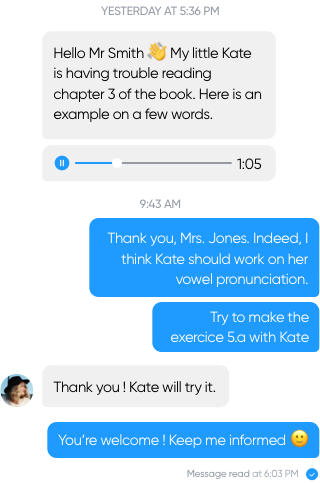 È facile da usare come la messaggistica istantanea, ma rispettoso della privacy degli insegnanti. Solo gli insegnanti possono avviare e terminare conversazioni private con i genitori. I messaggi possono essere tradotti dall'inglese in oltre cento lingue e viceversa. Niente più barriere linguistiche!