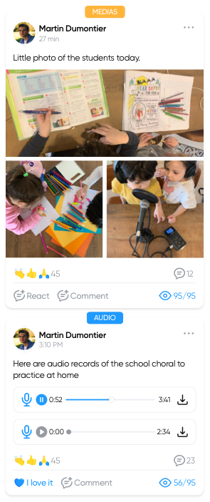 Gli insegnanti pubblicano foto, video, documenti, link, note vocali, ecc. Gli studenti e le loro famiglie possono rimanere connessi alla classe tramite il feed di classe.